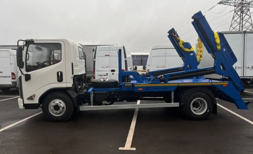 ???? Общее описание: Бункеровоз предназначен для погрузки и перевозки всех типов контейнеров, объемом до 8 куб.м. Телескопируемый «гусек» позволяет перевозить 2 контейнера, и производить разгрузку контейнера самосвальным методом. Гидравлические аутриггеры, заключенные в защитный короб, увеличивают устойчивость бункеровоза при погрузке